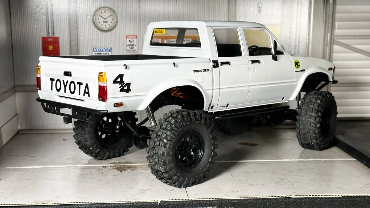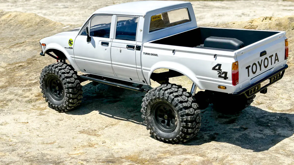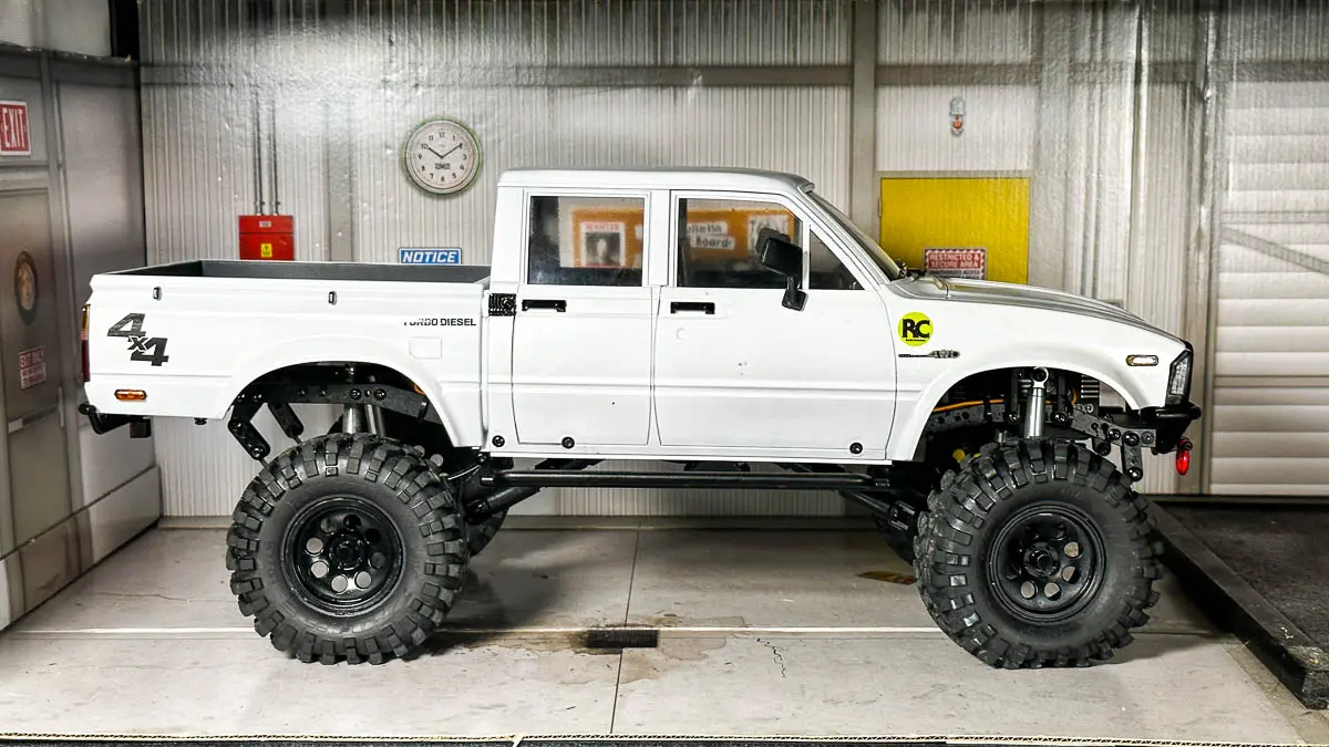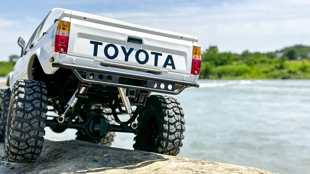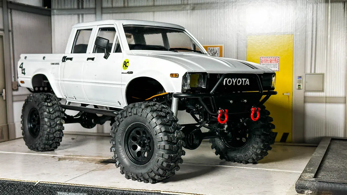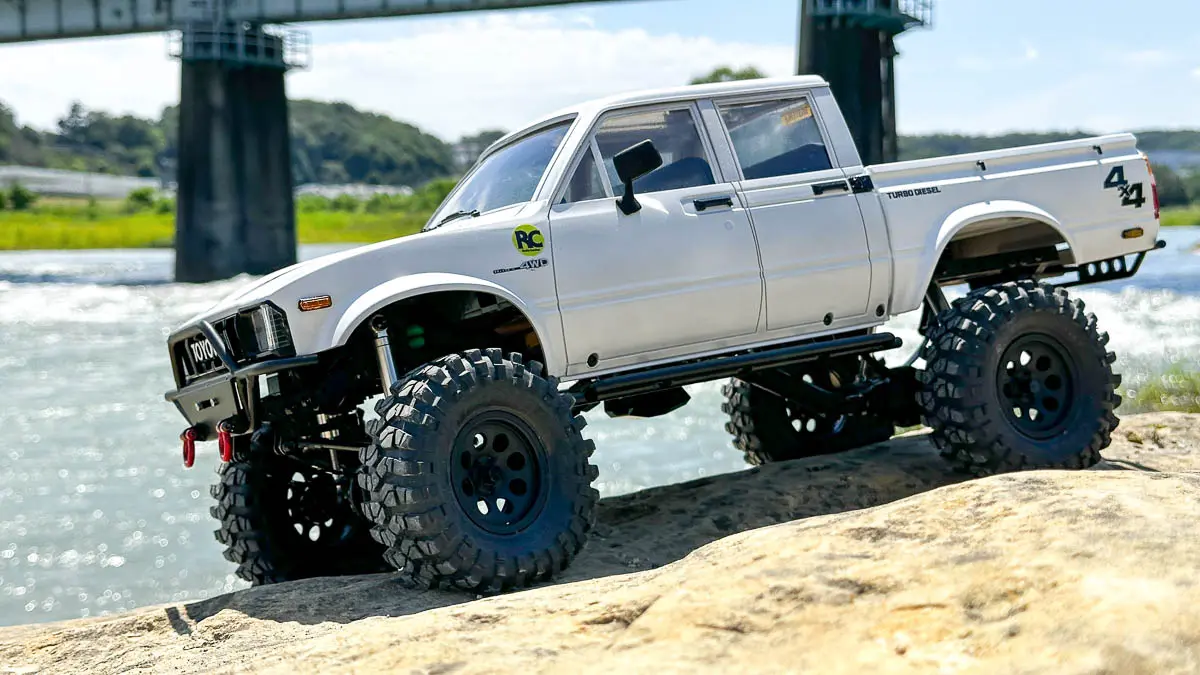 ボディは ROCK'N CRAWLERS の FIZZY(日産フィガロ風シルエット)を搭載し、見た目のユニーク感もこだわりのポイント。バッテリーをシャーシ中央低めに積み直すことで重心を下げ、急斜面でのスタビリティを確保。